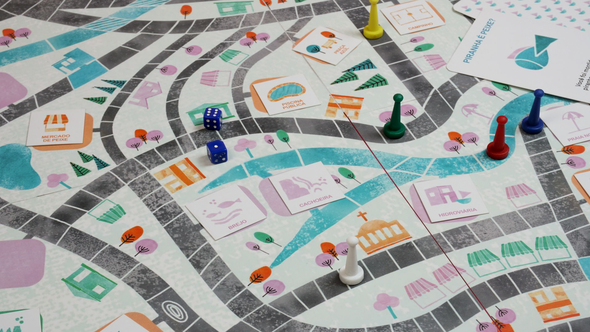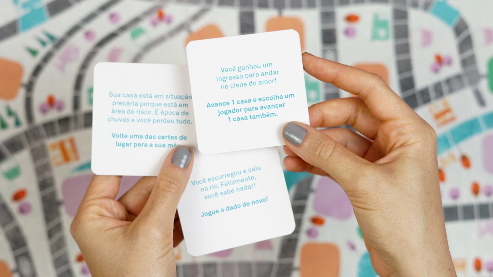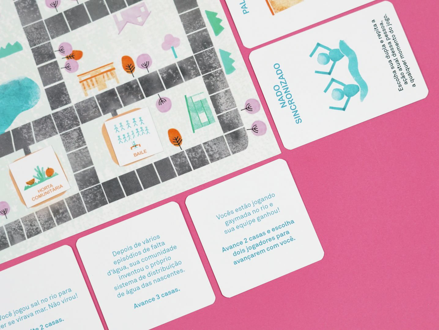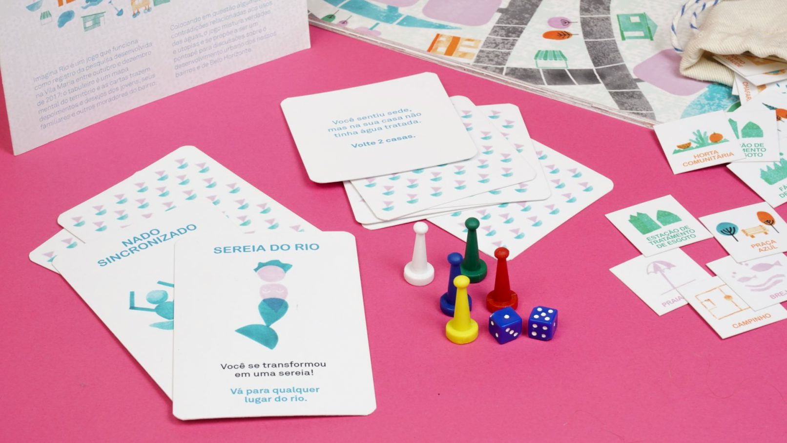 IMAGINA RIO é um jogo que funciona como registro dessa pesquisa desenvolvida na Vila Maria, guiada pela curiosidade das jovens: foram expedições pelo território, conversas com vizinhas, roda de conversa com moradoras antigas que frequentam o CRAS, expedição pelo Parque Nossa Senhora da Piedade e, para compartilhar as descobertas das oficinas, uma tarde de jogos com as famílias e amigas e cada participante ganhou seu kit de jogo.
