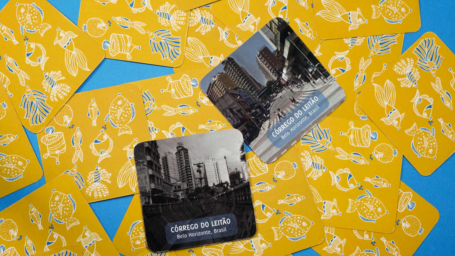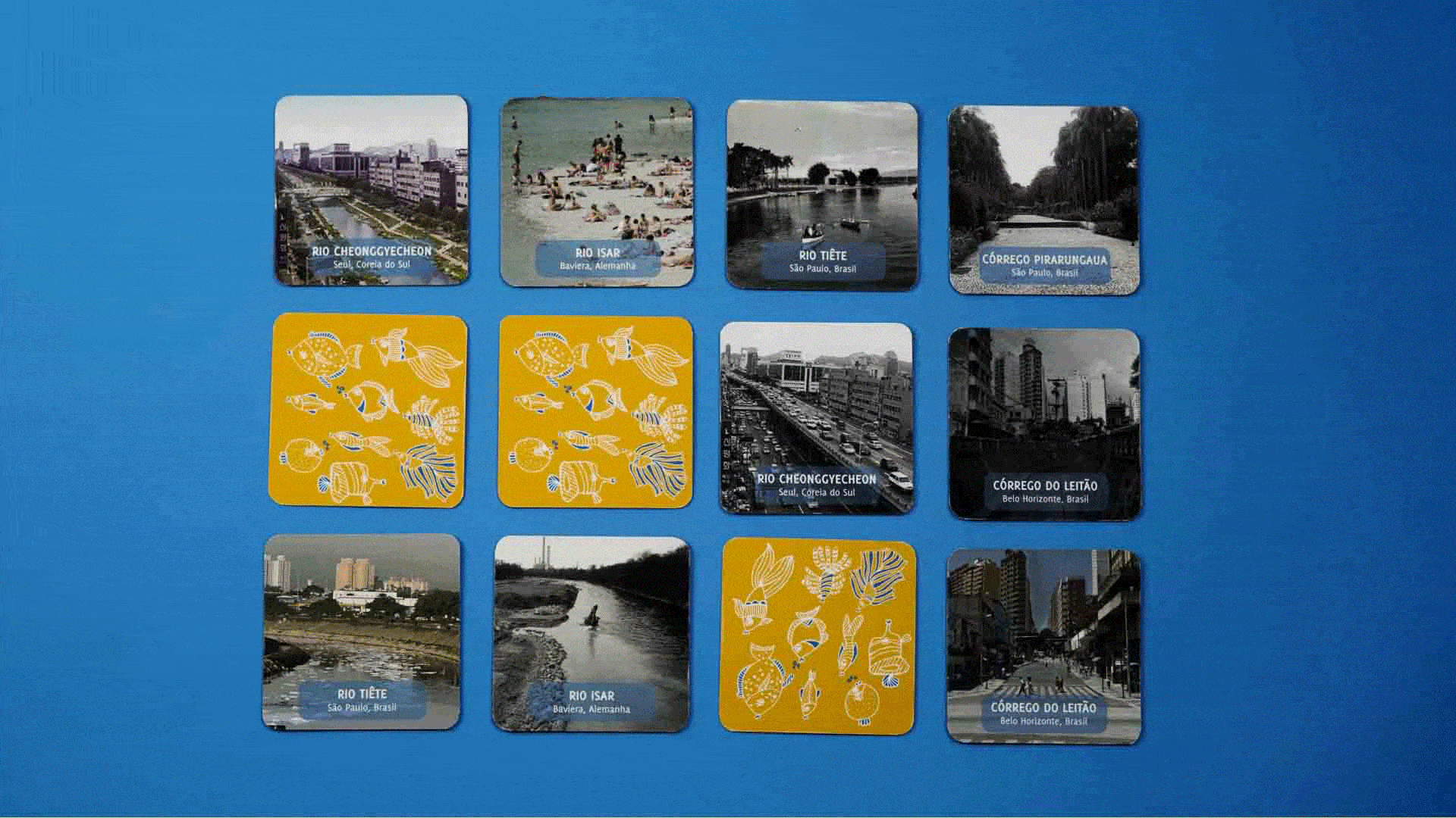 No jogo da memória RIOS POSSÍVEIS, as jogadoras são convidadas a encontrar duplas de cartas que representem o mesmo rio em duas situações: antes e depois de sua recuperação ou antes e depois de sua degradação. Através de alternativas reais de recuperação de rios no Brasil e no mundo, buscamos ampliar o imaginário e refletir sobre possibilidades de reinserção das águas na paisagem e cotidiano urbanos.