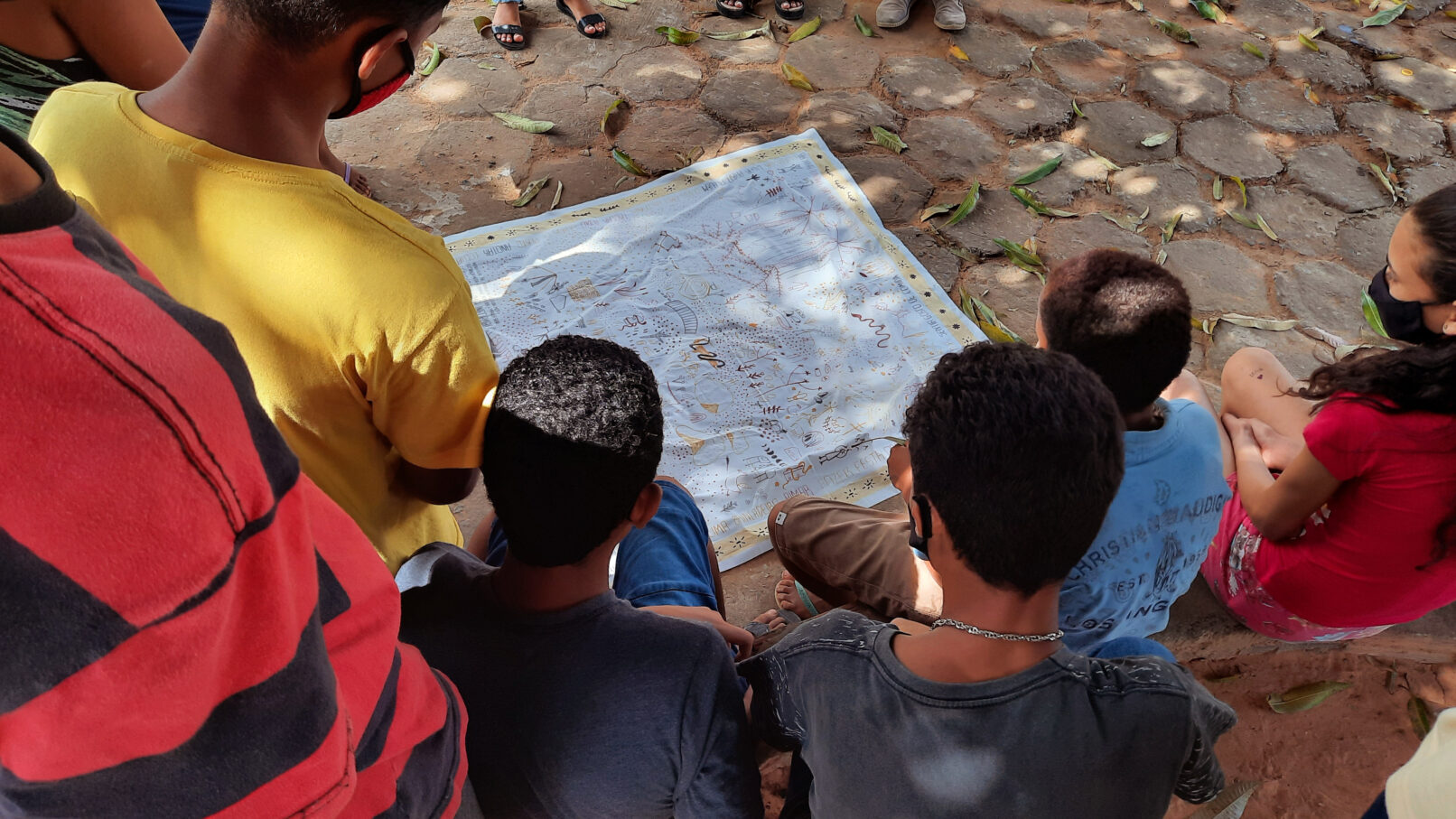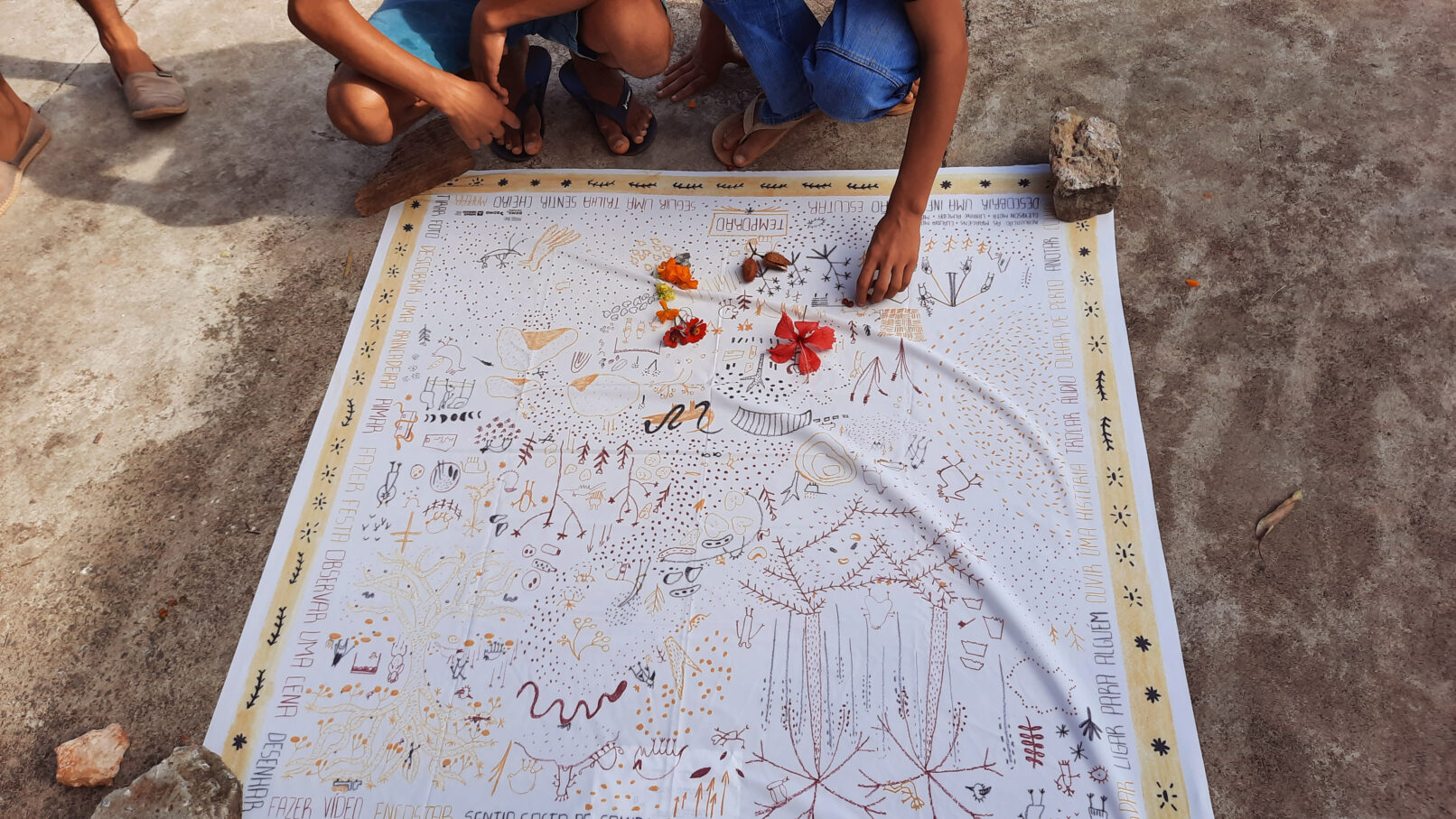 Cláudia Mota, Gleydson Mota, Layane Farias e Marília Silva foram nossas companheiras e, a cada encontro, uma das pesquisadoras propôs uma atividade para que conhecêssemos melhor os rios, as pessoas e os saberes da região. Foi assim que surgiu TEMPORÃO, um jogo de tabuleiro em tecido, que pode ser levado para muitos lugares, em que as águas do Rio São Francisco e de seus afluentes nos convidam para conhecer os mundos em volta e suas histórias.
